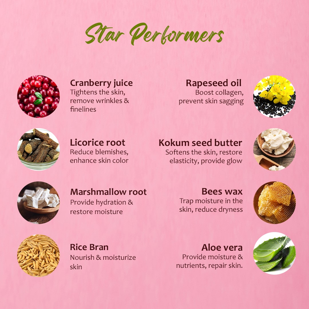 Cranberries –It help combat free radicals and slow the effects of premature aging, formation of fine lines, wrinkles & breakdown of collagen. It boost collagen production & provides a youthful looking glowing skin. Also contain natural acids that help prevent the clogging of pores.