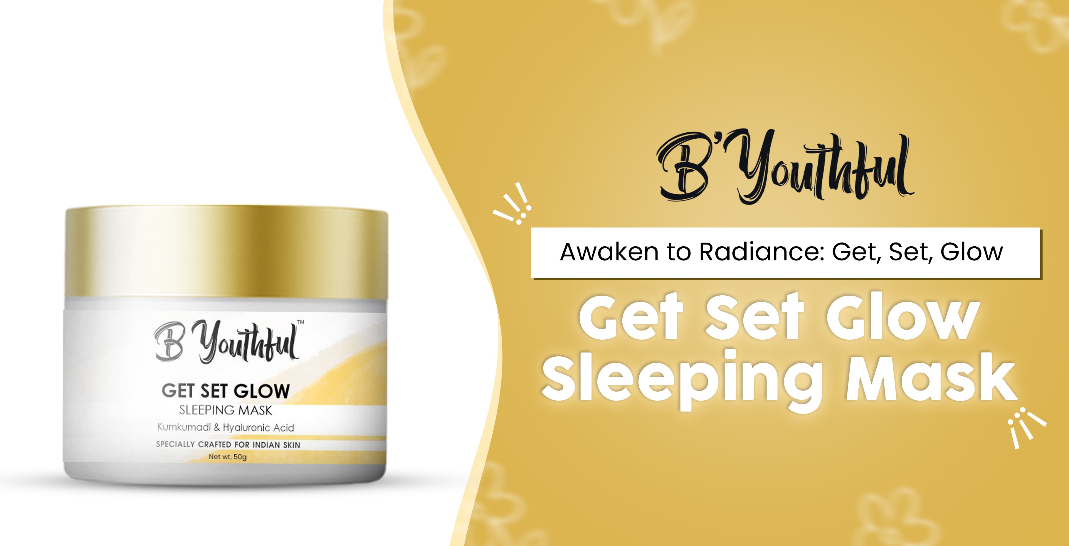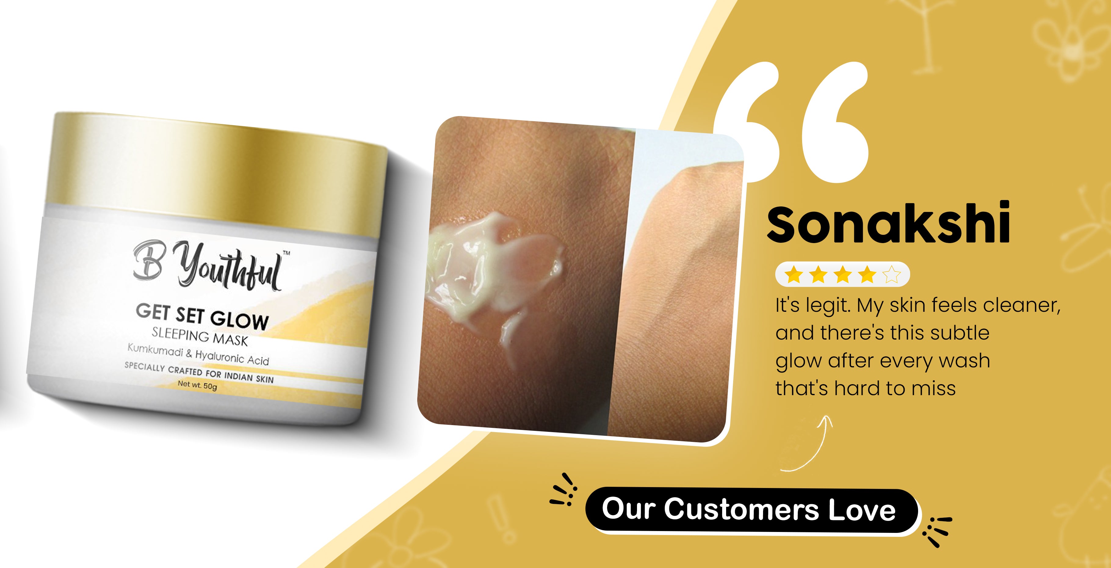 Looking to achieve glowing charming skin? Then try this super formula of "Get Set Glow Overnight Sleep Mask" enriched with the goodness of Kumkumadi and the hydrating power of Hyaluronic Acid. Get ready to unveil your skin's natural radiance with this extraordinary skincare wonder.